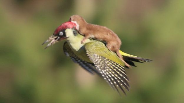 ஒரு மரங்கொத்தியின் முதுகில் மரநாய் ஒன்று பயணம் செய்யும் காட்சியை அமெச்சூர் புகைப்படக் கலைஞர் ஒருவர் படமெடுத்துள்ளார்.